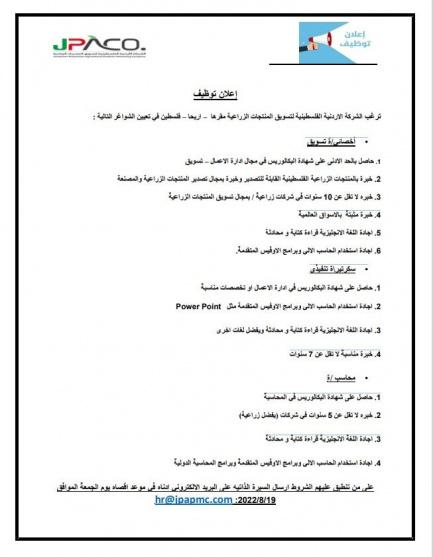 أعلنت الشركة الاردنية الفلسطينية لتسويق المنتجات الزراعية - أريحا - فلسطين، عن وظائف شاغرة "أخصائي/ة تسويق، وسكرتير/ة تنفيذي، بالإضافة إلى وظيفة محاسب/ة.