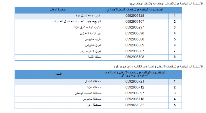 وكانت وكالة الغوث قد أعلنت عن أرقام للتواصل والاستفسار حول خدمات الإسكان والمساعدات الغذائية أو أي طارئ، إذ أن هناك رقم مخصص لمحافظة الشمال وآخر لمدينة غزة وأيضا للمنطقة الوسطى ورفح وخانيونس.