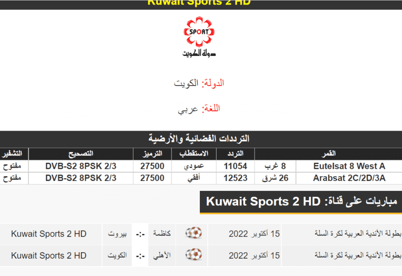 تردد قناة الكويت الرياضية "Kuwait Sport TV" على نايل سات هو 11054 عامودي ومعامل الترميز 27500 والاستقطاب 2/3، حيث يمكن من خلال هذا التردد مشاهدة مباراة الاهلي والكويت في بطولة الأندية العربية الأبطال لكرة السلة.