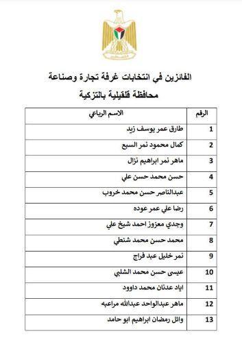 أعلنت اللجنة المركزية لإدارة انتخابات الغرف التجارية الصناعية، اليوم الاحد، عن أسماء الفائزين بالتزكية بعضوية مجلسي إدارة غرفتي تجارة وصناعة محافظتي جنين وقلقيلية.