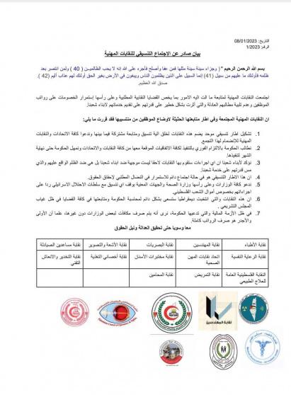 3.نؤكد لأبناء شعبنا ان اي اجراءات ستقوم بها النقابات لاحقا ليست موجهة ضد ابناء شعبنا بل هي ضد الظلم الواقع عليهم والذي مس قدرتهم على خدمة شعبنا.