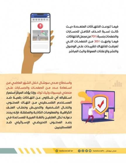 واستطاع صدى سوشال خلال الشهر الماضي من استعادة عدد من الصفحات والحسابات على منصتي فيسبوك وتيك توك، وإذا يؤكد المركز استمرار استقباله أي شكاوى عن انتهاكات رقمية ضد المستخدم الفلسطيني من انتهاك المحتوى، وانتخال الشخصية، والتحريض وخطاب العنف الكراهية، والمعلومات الكاذبة والمضللة، فإنه يجدد دعوته لكل العارفين باللغة العبرية للمساعدة في رصد المحتوى التحريضي الإسرائيلي ضد الفلسطينيين.