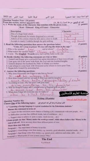 إجابات امتحان اللغة الإنجليزية الورقة الثانية توجيهي فلسطين 2023 الفرع الأدبي في كافة المحافظات الفلسطينية بقطاع غزة والضفة الغربية والقدس ومدارس الخارج مع الامتحان الخامس الذي يتقدم به الطلبة اليوم الأربعاء.