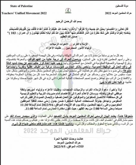 حراك المعلمين يعلن الإضراب غدًا ويدعو للاعتصام