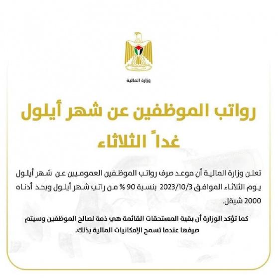 وأوضحت المالية في بيانٍ لها أن صرف راواتب الموظفين سيكون يوم غدٍ الثلاثاء الموافق 3/10/2023 بنسبة 90 % من راتب شهر أيلول وبحد أدناه 2000 شيقل.