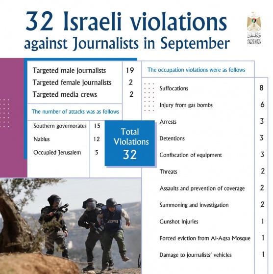 رصدت وزارة الإعلام 32 انتهاكًا احتلاليًا بحق الصحافيين الفلسطينيين خلال أيلول الماضي، إذ استهدف جيش الاحتلال الإسرائيلي (19) صحافيًا بينهم صحافيتين وطاقمين.