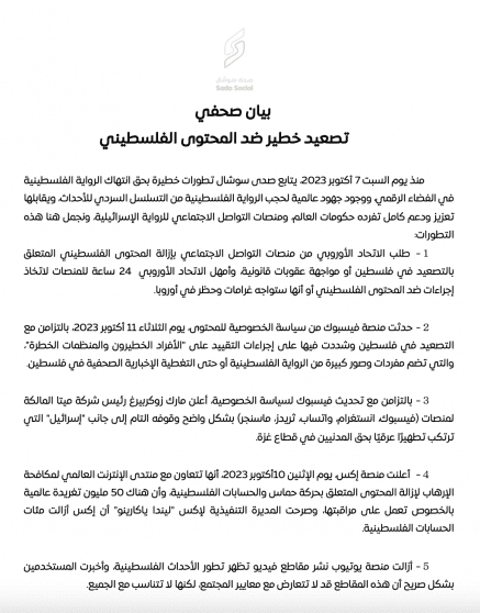 منذ يوم السبت 7 أكتوبر 2023، يتابع صدى سوشال تطورات خطيرة بحق انتهاك الرواية الفلسطينية في الفضاء الرقمي، ووجود جهود عالمية لحجب الرواية الفلسطينية من التسلسل السردي للأحداث، ويقابلها تعزيز ودعم كامل تفرده حكومات العالم، ومنصات التواصل الاجتماعي للرواية الإسرائيلية، ونجمل هنا هذه التطورات:
