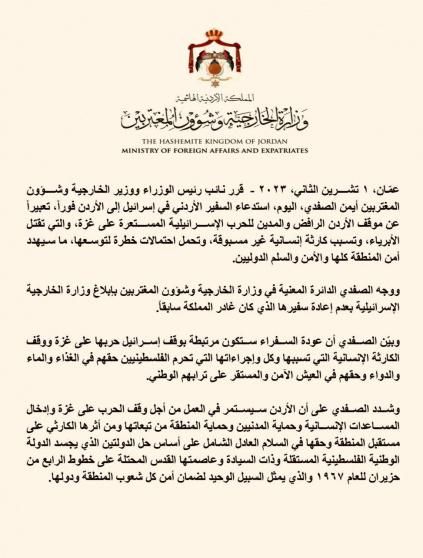 وبيّن الصفدي أن عودة السفراء ستكون مرتبطة بوقف إسرائيل حربها على غزة ووقف الكارثة الإنسانية التي تسببها وكل وإجراءاتها التي تحرم الفلسطينيين حقهم في الغذاء والماء والدواء وحقهم في العيش الآمن والمستقر على ترابهم الوطني.