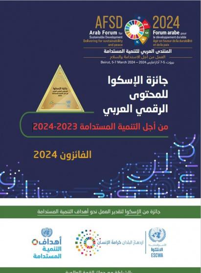 علما ان، الإسكوا في عام 2021 أطلقت جائزة الإسكوا للمحتوى الرقمي العربي من أجل التنمية المستدامة وذلك بهدف تكريم الجهود المبذولة في تطوير المحتوى الرقمي العربي وتقدير أفضل المشاريع الرقمية التي تركز على أو تتعلق بأهداف التنمية المستدامة. وتتعاون الإسكوا مع جوائز القمة العالمية في تنفيذ الجائزة التي شملت ثلاث دورات منذ إطلاقها، وتهدف جوائز الإسكوا للمحتوى الرقمي إلى تعزيز التنمية المستدامة وسد الفجوة الرقمية في المنطقة العربية، من خلال تكريم الجهود في تطوير وابتكار المحتوى الرقمي باللغة العربية وتعزيز الوصول إلى الإنترنت والخدمات الرقمية في المجتمع العربي