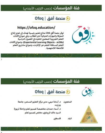 حيث فاز مشروع منصة "أفق" / مركز التعليم المستمر في جامعة بيرزيت عن فئة المؤسسات، حيث توفر هذه المنصة ثلاث نماذج تعليمية مبتكرة لدعم المعرفة والمهارات الحياتية للطلاب، وتهدف هذه النماذج إلى تعزيز إنتاج المعرفة والمهارات الحياتية لدى الطالب ويركز على المهارات الحياتية الأساسية مثل التفكير النقدي وحل المشاكل