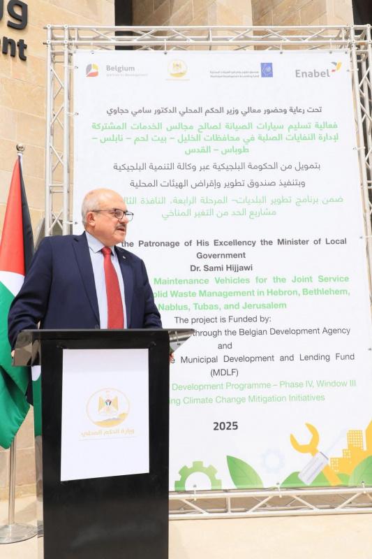 سلم وزير الحكم المحلي د. سامي حجاوي، سيارات متنقلة للصيانة تعتبر الاولى من نوعها ولصالح خمسة مجالس خدمات مشتركة في المحافظات الشمالية شملت كل من: القدس، والخليل، وبيت لحم، ونابلس، وطوباس، وذلك بتمويل من الحكومة البلجيكية عبر وكالة التنمية البلجيكية Enabel in Palestine وبتنفيذ من صندوق تطوير واقراض الهيئات المحلية ضمن برنامج تطوير البلديات المرحلة الرابعة، النافذة الثالثة لدعم مشاريع الحد من التغير المناخي.