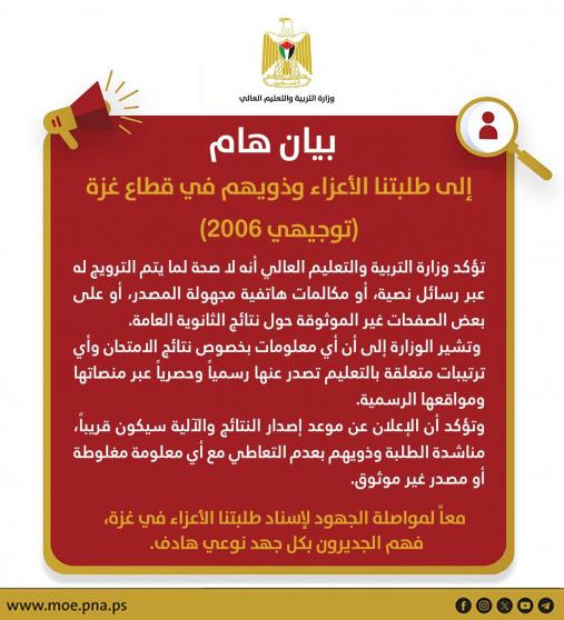 التربية تصدر بيانا بشأن موعد نتائج توجيهي 2006 الثانوية العامة في غزة