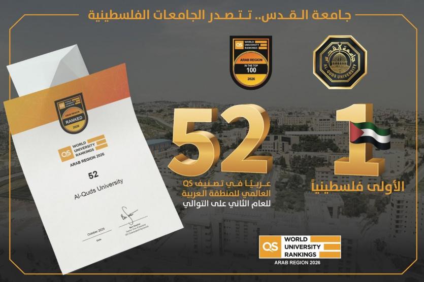 حافظت جامعة القدس على المرتبة (52) عربيًا للعام الثاني على التوالي، والمرتبة الأولى فلسطينيًا في تصنيف QS World University Rankings: Arab Region 2026، وذلك وفق النتائج الصادرة رسميًا عن مؤسسة QS العالمية.