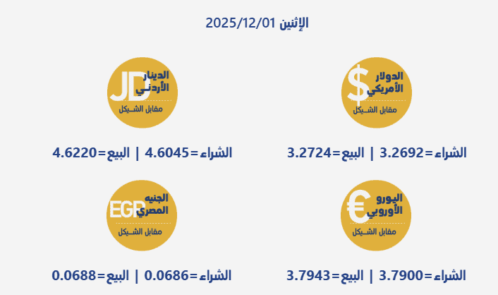 جاءت أسعار صرف العملات مقابل الشيقل الإسرائيلي، اليوم الإثنين، بحسب سلطة النقد الفلسطينية، على النحو التالي: