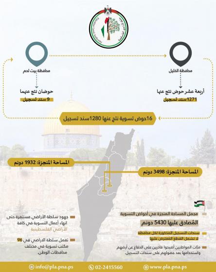 أعلنت سلطة الأراضي عن إنجاز جديد ضمن أعمال مشروع تسوية الأراضي والمياه في الضفة الغربية، تمثل في المُصادقة على 16 حوض تسوية من قبل قاضي التسوية، نتج عنها إصدار 1280 سند تسجيل بعد استكمال جميع الإجراءات القانونية المعتمدة.