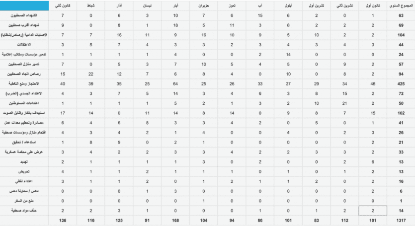 وثّقت لجنة الحريات في نقابة الصحفيين الفلسطينيين خلال عام 2025 ما مجموعه: 1317 جريمة وانتهاكًا واعتداء بحق الصحفيين الفلسطينيين، توزعت على النحو الآتي: