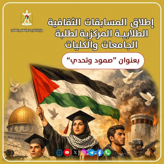 أطلقت وزارة التربية والتعليم العالي، اليوم، من خلال وحدة الإرشاد والتوجيه والشؤون الطلابية مجموعة من المُسابقات الثقافية المُشتركة بين طلبة مؤسسات التعليم العالي الفلسطينية، للعام الأكاديمي 2026-2025، وذلك بالشراكة مع لجنة النشاطات الطلابية.