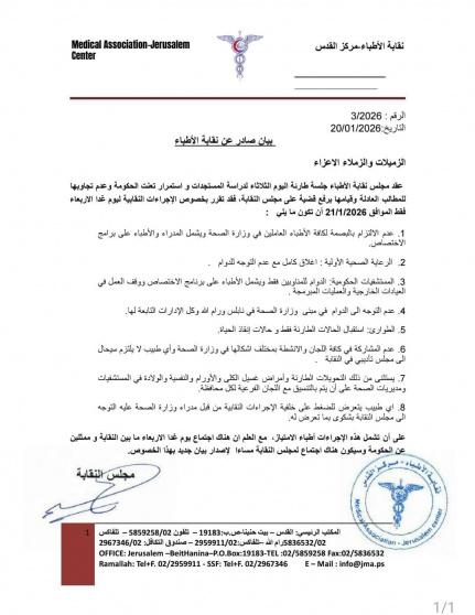وقالت النقابة، في بيان رسمي صدر عنها، إن المجلس ناقش خلال جلسته الطارئة إصرار الحكومة على تجاهل مطالب الأطباء وقيامها برفع قضايا على مجلس النقابة، الأمر الذي دفع المجلس إلى اتخاذ قرارات نقابية جديدة سيبدأ العمل بها يوم غدٍ الأربعاء الموافق 21 كانون الثاني/يناير 2026 فقط.