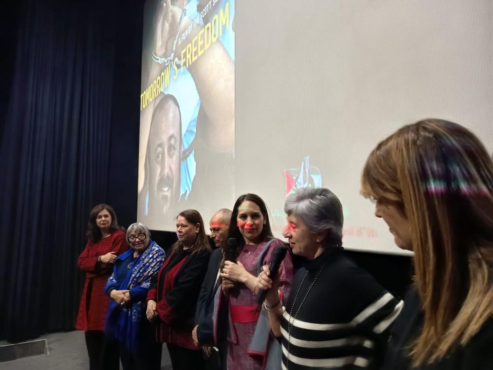 وشهد عرض الفيلم حضورًا رسميًا ووطنيًا لافتًا، تقدّمهم زوجة الأسير القائد مروان البرغوثي المناضلة فدوى البرغوثي(أم القسام) وسفيرة دولة فلسطين لدى إيطاليا منى أبو عمارة، وسفيرة دولة فلسطين لدى بلجيكا والاتحاد الأوروبي ولوكسمبورغ د. أمل جادو، وعضو المجلس الثوري لحركة فتح محمد اللحام، إلى جانب عدد من أبناء الجالية الفلسطينية ونشطاء ومتضامنين إيطاليين.