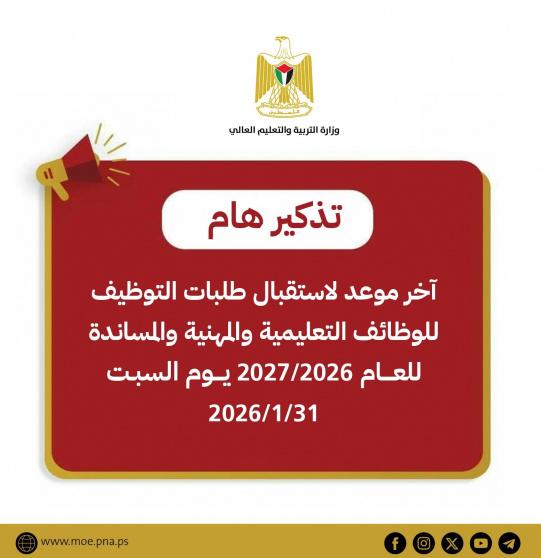 أعلنت وزارة التربية والتعليم العالي، أن يوم السبت 31/012026 هو آخر موعد لاستقبال طلبات التوظيف للوظائف التعليمية والمهنية والمساندة للعام الدراسي 2026/2027، وذلك من خلال البوابة الإلكترونية لديوان الموظفين العام www.gpc.pna.ps، وفقاً لإعلان الوزارة السابق.