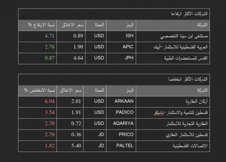 وأغلق مؤشر القدس منخفضاً بمقدار 8.46 نقطة بنسبة تراجع بلغت 1.35% ليغلق عند مستوى 617.60 نقطة، كما أغلق مؤشر القدس الإسلامي على انخفاض بنسبة 0.95%. وشهدت الجلسة تداول أسهم 14 شركة؛ ارتفعت أسعار أسهم 3 شركات، فيما انخفضت أسعار 7 شركات، واستقرت أسعار 4 شركات أخرى.