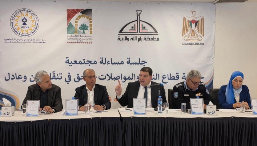 نظم مركز إعلام حقوق الإنسان والديمقراطية "شمس"، جلسة مساءلة مجتمعية حول "حوكمة قطاع النقل والمواصلات: الحق في تنقل آمن وعادل"، حضرها ممثلون/ات عن مؤسسات المجتمع المدني الفلسطينية (الحقوقية، النسوية، الشبابية، التنموية)، ممثلون/ات عن المؤسسات الرسمية المدنية والأمنية، ممثلون/ات عن النقابات والاتحادات ذات الصلة، محامين، باحثين وأكاديميين، وناشطين مجتمعيين.