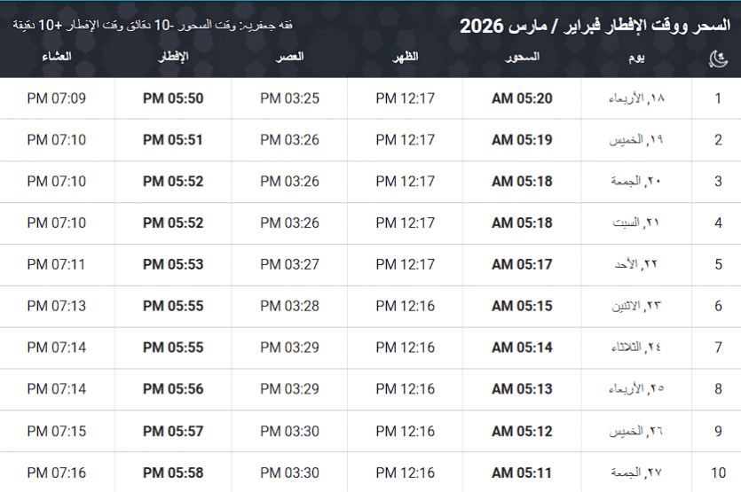 أذان الفجر (الإمساك): 05:10 صباحاً.