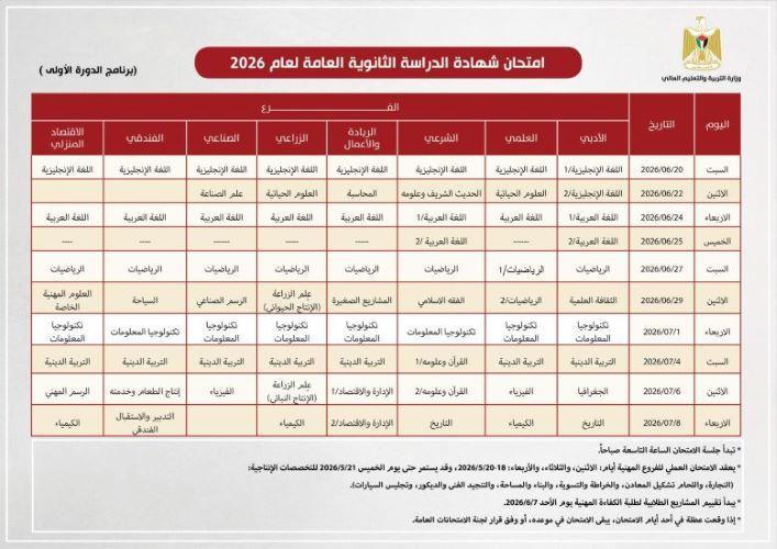 وأوضحت الوزارة اليوم الأربعاء، أن امتحانات الدورة الأولى ستبدأ يوم السبت الموافق 20/6/2026، وتستمر حتى الأربعاء 8/7/2026، فيما تبدأ امتحانات الدورة الثانية يوم السبت 15/8/2026، وتستمر حتى الخميس 27/8/2026.