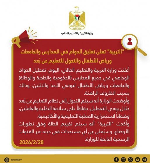 وأكدت التربية أنه سيتم تقييم الحالة وفق تطورات الأوضاع، وسيُعلن عن أي مستجدات في حينه عبر القنوات الرسمية التابعة للوزارة.