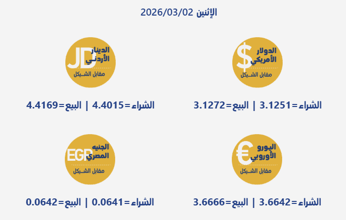 جاءت أسعار صرف العملات مقابل الشيقل الإسرائيلي، اليوم الإثنين، بحسب سلطة النقد الفلسطينية، على النحو التالي: