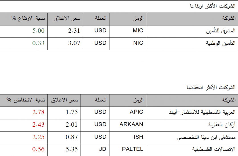 وأغلق مؤشر القدس لجلسة اليوم منخفضاً بمقدار 3.17 نقطة، بنسبة انخفاض بلغت 0.53% عن إغلاق الجلسة السابقة، ليغلق عند مستوى 598.92 نقطة، وأغلق مؤشر القدس الإسلامي منخفضاً بنسبة 0.32%، فيما شهدت جلسة اليوم تداول 9 شركات، حيث ارتفعت أسهم شركتين، في المقابل انخفضت أسعار أسهم 4 شركات، واستقرت أسعار أسهم 3 شركات أخرى.