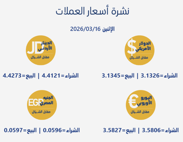 جاءت أسعار صرف العملات مقابل الشيقل الإسرائيلي، اليوم الإثنين، بحسب سلطة النقد الفلسطينية، على النحو التالي:
