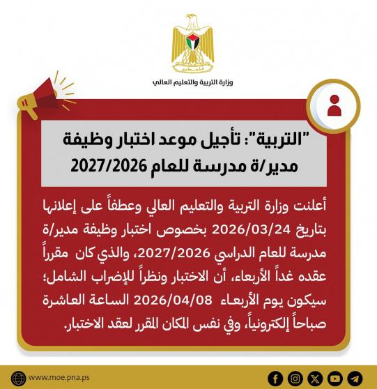 أعلنت وزارة التربية والتعليم العالي وعطفاً على إعلانها بتاريخ 24/03/2026 بخصوص اختبار وظيفة مدير/ة مدرسة للعام الدراسي 2026/2027 ، والذي كان مقرراً عقده غدا الأربعاء، أن الاختبار ونظرا للإضراب الشامل؛ سيكون يوم الأربعاء 08/04/2026 الساعة العاشرة صباحاً إلكترونياً، وفي نفس المكان المقرر لعقد الاختبار