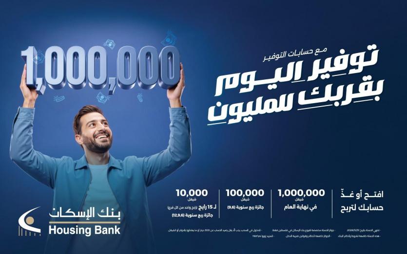 في إطار التزام بنك الإسكان بتقديم قيمة مضافة لعملائه، وانطلاقا من سياسته الهادفة لتعزيز ثقافة الادخار ومكافأة المدخرين على ولائهم وثقتهم، أطلق بنك الإسكان حملته الترويجية الخاصة بحسابات التوفير للعام 2026 تحت شعار "توفير اليوم..بقربك للمليون" والتي تعد واحدة من أضخم الحملات لهذا العام بحيث تبلغ الجائزة الكبرى مليون شيقل تقدم في نهاية العام لرابح واحد.