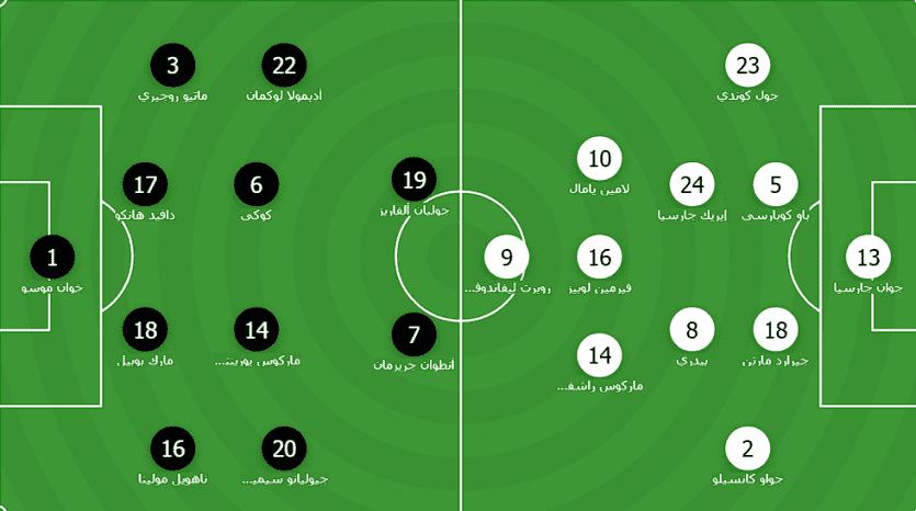موسو، مولينا، بوبيل، هانكو، روجيري؛ جوليانو، يورنتي، كوكي، لوكمان؛ جريزمان وجوليان ألفاريز.