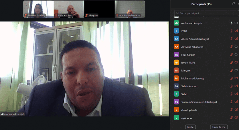 وشارك في الجلسة عدد من الصحفيين/ات وممثلي المؤسسات الإعلامية ومنظمات المجتمع المدني، إضافة للمستشار القانوني لمركز مدى أ. فراس كراجة.