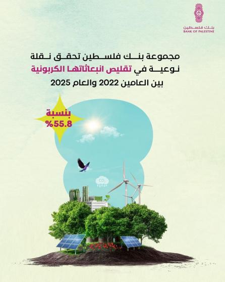 أعلنت مجموعة بنك فلسطين عن تحقيق إنجاز جوهري في الالتزام بالحفاظ على البيئة وتعزيز العمل لمجابهة التغير المناخي عبر خفض انبعاثاتها الكربونية بنسبة 55.8% خلال الفترة ما بين عامي 2022 و2025، في خطوة تضعها في موقع ريادي، والعمل ضمن المؤسسات المالية التي تتبنى ممارسات ممثلة نحو الاستهلاك المسؤول، وذلك ضمن إطار استراتيجي متكامل يراعي التوازن بين الأداء المالي والأثر البيئي والاجتماعي، ويسهم فعليًا في الحد من آثار التغير المناخي.