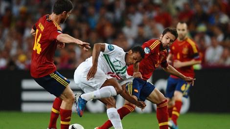 حسم المنتخب الإسباني حامل اللقب مواجهة "ديربي" شبه الجزيرة الإيبيرية أمام جاره البرتغالي وتأهل إلى المباراة النهائية من بطولة كأس أمم أوروبا لكرة القدم المقامة في بولندا وأوكرانيا، بعد أن فاز عليه (4-2) بركلات الترجيح، إثر انتهاء الوقتين الأصلي والإضافي بالتعادل السلبي، في أولى مباريات الدور نصف النهائي على ملعب دونباس آرينا في مدينة دونتسك الأوكرانية.
