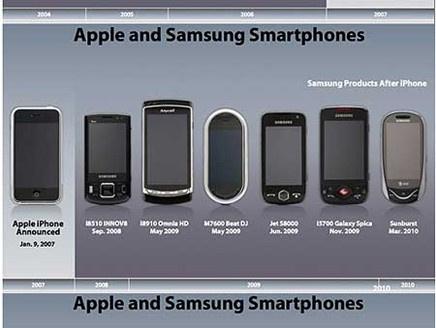 ويتركز الجدل القضائي بين الشركتين حول هل اقتبست سامسونغ شيئاً من تصاميم أبل أم لا؟ ومنذ مطلع العام الماضي تقدمت أبل بدعوى قضائية ضد سامسونغ، وهي تعلق الآمال على إقناع المحلفين وقضاة إحدى محاكم كاليفورنيا التي تنظر في هذه القضية بصدق ادعاءاتها من خلال الاستعانة بثلاث صور جهزها طاقم محاميها، وهي صور تظهر الأجهزة التي تنتجها سامسونغ إلى جانب الايفون منتج شركة أبل، ونشر موقع AllthingsD الصور الثلاث التي قدمتها أبل للمحكمة معتمدة على أنها الدليل على اقتباس سامسونغ لتصاميمها، وتظهر الصور الثلاث تصاميم أجهزة سامسونغ قبل ظهور جهاز الايفون وبعد ظهوره، وتستند أبل في ادعائها إلى أن سامسونغ تحولت في تصاميمها بعد ظهور الايفون والاقتباس من تصميمه.