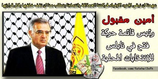 أكد رئيس امين سر المجلس الثوري لحركة "فتح" أمين مقبول ان اللجنة المركزية للحركة كلفته برئاسة قائمة الحركة "قائمة الاستقلال والتنمية" لخوض انتخابات بلدية نابلس.