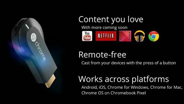كشفت شركة جوجل عن جهاز يعمل كوسيط لبث محتوى الهواتف الذكية أو الحواسب اللوحية أو المحمولة على أجهزة التلفاز، وهو الجهاز الذي أطلقت عليه اسم “ChromeCast”.