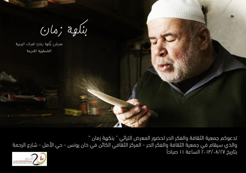 في تظاهرة فنية إبداعية تحتفي بشيوخ المهن والحرف التراثية بقطاع غزة، وتستقرأ فصولاً من التراث الحضاري والإنساني للبيئة المحلية الفلسطينية، اجتمعت في أحضان المركز الثقافي التابع لجمعية الثقافة والفكر الحر،صباح اليوم، أكثر من 40 صورة فوتوغرافية وثقت بشكل ابداعى ينبض بالحياة أكثر من 30 مهنة وحرفة تراثية فلسطينية في معرض فني بعنوان "نكهة زمان ".