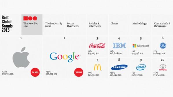 وقُدرت قيمة العلامة التجارية لشركة “آبل” بـ 98.3 مليار دولار أمريكي، وبمعدل زيادة عن العام الماضي 2012 بمقدار 28%، بينما قدرت قمية علامة شركة “جوجل” بـ 93.3 مليار، ولكن بمعدل زيادة سنوية أكبر من “آبل” وصل إلى 34%.