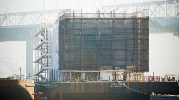 وتظهر صور في ورشة مراقبة بالكاميرات، بناية من طوابق عدة ترتفع على عبارة طولها حوالى 80 متراً.