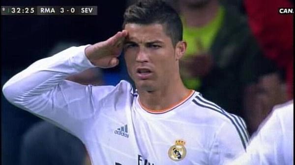 وأدى هدّاف النادي الملكي تحية عسكرية لجمهور ملعب "سانتياغو بيرنابيو" موجهاً بذلك رسالة مبهمة إلى رئيس الاتحاد الدولي لكرة القدم، السويسري جوزيف سيب بلاتر، الذي شبّه "رونالدو" بالقائد العسكري على أرضية الملعب خلال محاضرة ألقاها في جامعة أوكسفورد يونيون الإنجليزية؛ محاكياً في الوقت نفسه حركة عسكرية ضحك عليها جميع الحاضرين.
