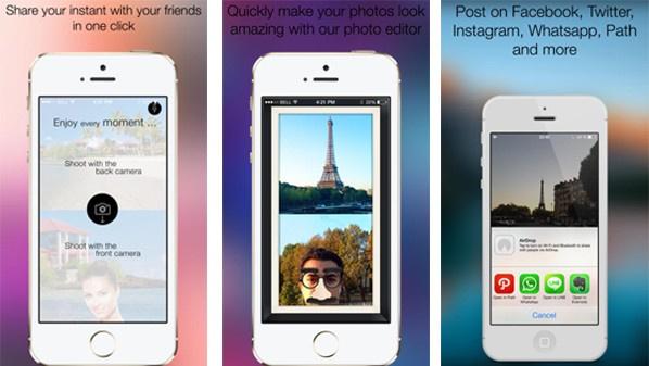 بعد تشغيل التطبيق تظهر واجهة التصوير وفي منتصف الشاشة نلاحظ وجود زر التصوير، بالضغط عليه يتم التقاط الصورة باستخدام الكامير الخلفية، وبالضغط عليه مرة ثانية يتم التقاط صورة بالكاميرا الأمامية وبعد الإنتهاء يظهر شريط جانبي يمكن من خلاله إضافة تأثيرات على الصور أو يمكن مشاركتها مباشرةً.