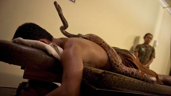 والتدليك بالأفاعي هو إحدى الخدمات الـ300 التي يقدمها مركز الاستجمام، كما أن الخدمات الأخرى ليست أقل غرابة منها، ففي إطار إحدى الخدمات، يتنكر أخصائي التدليك بزي غوريلا.