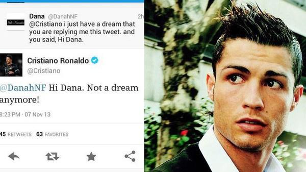 وكتبت الفتاة التي تدعى "دانا" على حساب رونالدو قائلة: "لدي حلم واحد فقط، وهو أن ترد على في هذه التغريدة وتقولي لي.. أهلا دانا"، وبعد وقت وجيز سارع رونالدو للرد ووجه حديثه لها قائلاً: "أهلا دانا.. طلبك لم يعد حلماً الآن".