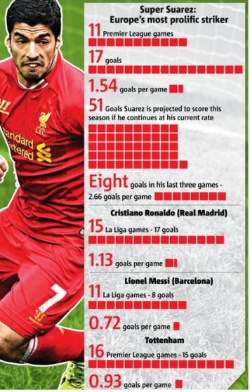 سواريز نجح في أخر ثلاث مباريات في تسجيل ثمانية أهداف بنسبة تهديف بلغت (2.66) هدف في كل مباراة ، وهو ما كان له الدور الكبير في وجود ليفربول مطارداً لأرسنال" المتصدر"على قمة الدوري الإنجليزي ، بعد أن قلص الفارق معه إلى نقطتين فقط.
