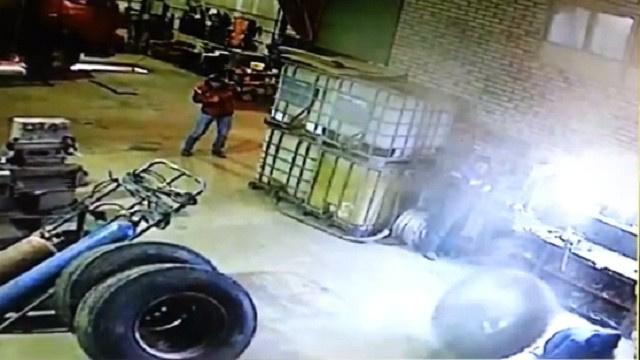عامل في ورشة يطير في الهواء بسبب انفجار عجلة ضخمة